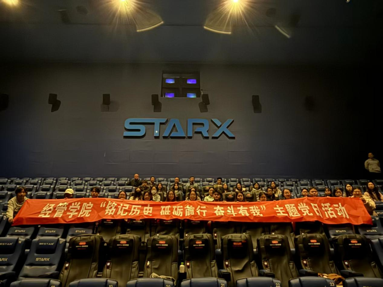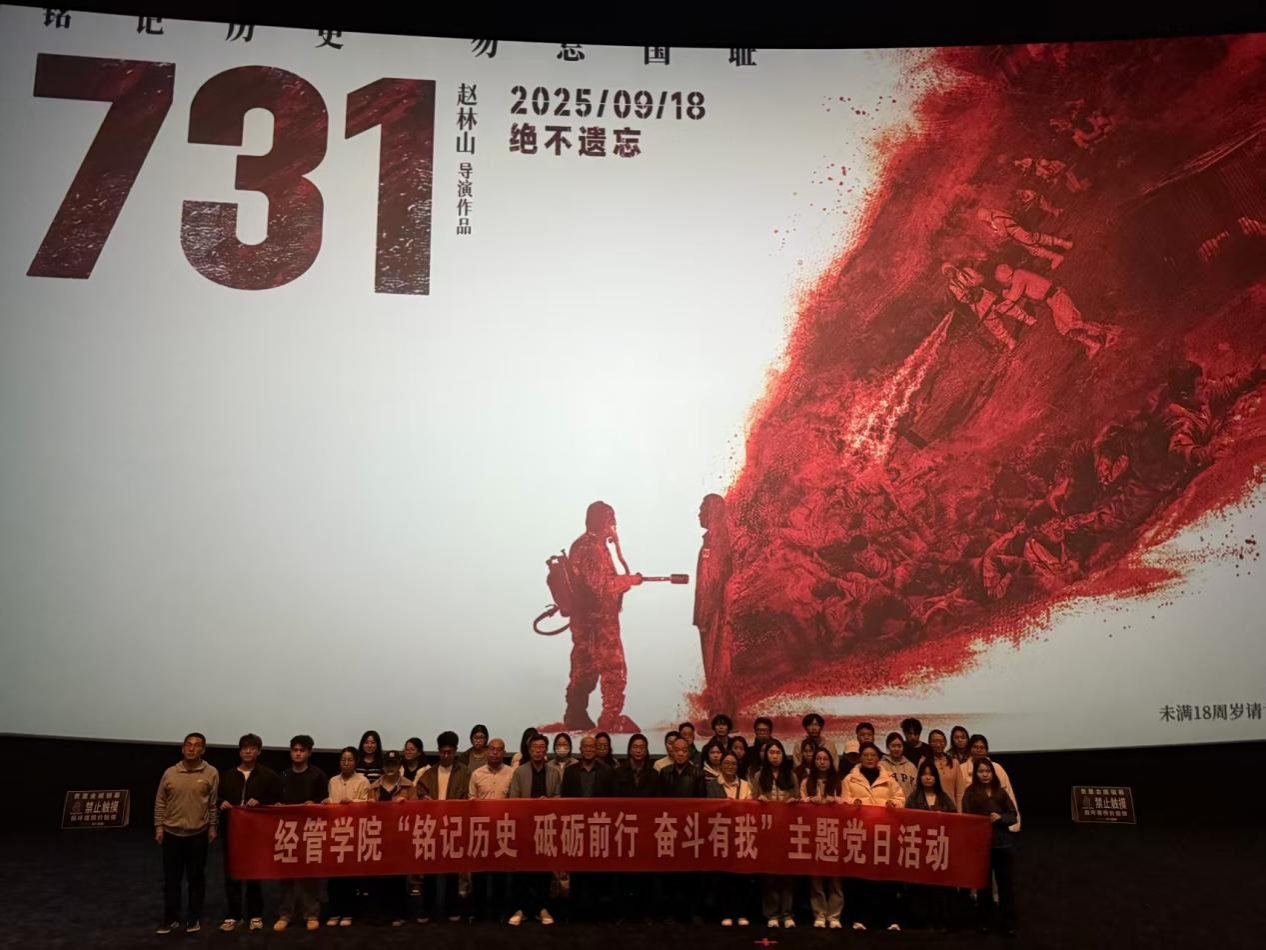 为纪念中国人民抗日战争暨世界反法西斯战争胜利80周年,增强广大师生国防意识、传承红色基因、厚植爱国情怀。10月16日,经管学院党委组织师生前往吾悦广场星轶影城,开展“铭记历史 砥砺前行 奋斗有我”主题党日活动,集体观看历史题材电影《731》,以影像为媒回望峥嵘岁月,以历史为鉴汲取奋进力量。