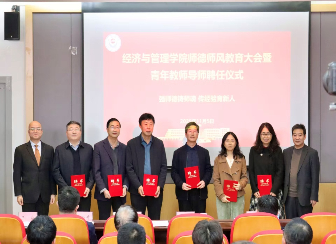 会上,党委教师工作部部长张琰图介绍了学校师德师风和青年教师队伍建设取得的成绩,充分肯定了经管学院近年取得的成效。他强调青年教师导师制作为学校新进教师入职“521培训模式”的重要组织部分,是传承教育初心、锻造高素质师资队伍的关键举措。勉励聘任导师要以身作则、倾囊相授、关爱包容,青年教师要虚心求教、勇于实践、开拓创新,并表示将持续提供平台与资源支持。随后,副院长白鹏飞宣读了经管学院青年教师导师聘任决定。张琰图部长与付旭书记共同为新聘导师颁发了聘书。马莉教授、张轩栋博士分别作为导师和青年教师代表作了表态发言。董庆来院长在讲话中指出师德师风是评价教师队伍素质的第一标准,全体教师要强化底线思维,认识到师德师风建设的极端重要性,更要狠抓过程管理,确保工作落到实处。青年教师导师制要严格按照《经管学院青年教师导师制实施办法》,遵循“双月沟通、季度督查、学期总结、年度考核”管理机制,实现闭环培养。